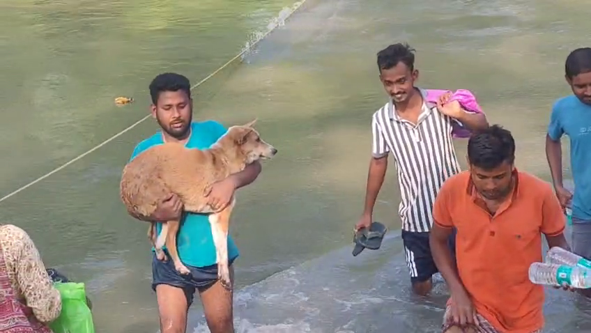 বর্তমানে নদীর দুধারে রসি বাঁধা আছে রসি ধরে নদী পারাপার চলছে।