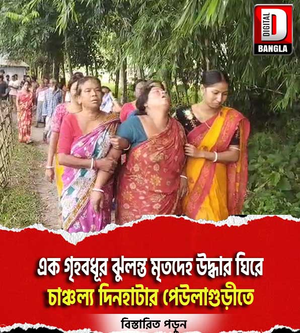 এক গৃহবধূর ঝুলন্ত দেহ উদ্ধারের ঘটনায়, পেউলাগুড়ী এলাকায় চাঞ্চল্য । বৃহস্পতিবার সকালে স্থানীয় সূত্রে জানা গিয়েছে , ভোরে সাগরিকা বর্মন নামের ওই গৃহবধূর শোবার ঘরে তার ঝুলন্ত দেহ পরিবারের সদস্যরা দেখতে পান । বাড়ীর লোকজনের চিৎকারে আশপাশের লোকজন ছুটে এসে দিনহাটা থানার পুলিশকে খবর দেন। দিনহাটা থানার পুলিশ দেহ উদ্ধার করে ময়নাতদন্তের জন্য পাঠায়। তবে কি ভাবে ওই গৃহবধূর মৃত্যু হল তা জানা যায়নি, খুন নাকি আত্মহত্যা দিনহাটা থানার পুলিশ ঘটনার তদন্ত শুরু করছে। এই ঘটনায় এলাকায় শোকের ছায়া নেমে এসেছে।