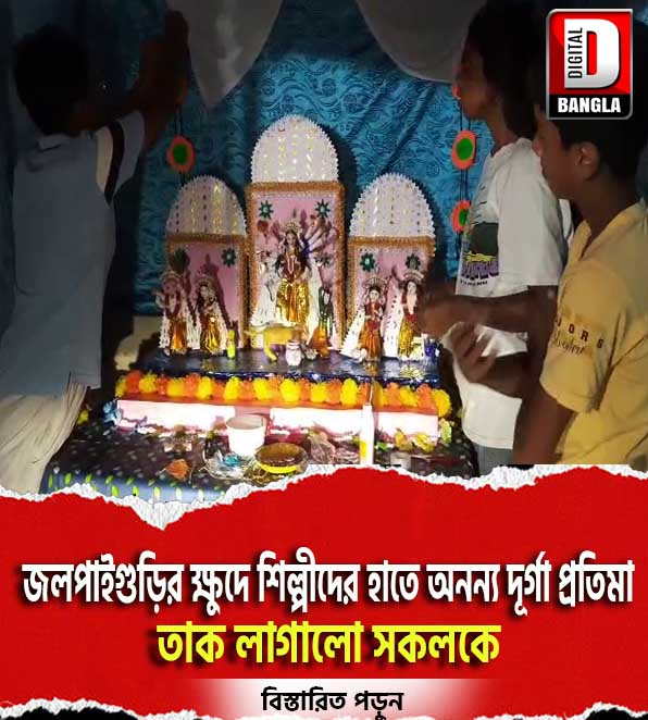 জলপাইগুড়ির মোহিতনগরে ক্ষুদে শিল্পীদের হাতে অনন্য দূর্গা প্রতিমা, তাক লাগালো সকলকে।দূর্গা পুজো মানেই আড়ম্বর, থিম, আলো আর জনজোয়ার। কিন্তু এবার জলপাইগুড়ির মোহিতনগরে নজর কেড়েছে একদল স্কুলপড়ুয়ার হাতে গড়া একেবারেই ভিন্নধর্মী দূর্গা প্রতিমা। ছোট ছোট হাতের অসাধারণ শিল্পকর্ম আজ আলোচনার কেন্দ্রে। মোহিতনগরের অষ্টম ও নবম শ্রেণির কয়েকজন ছাত্রছাত্রী শুধুমাত্র পুরনো খবরের কাগজ রিসাইকেল করে, তার সঙ্গে ক্লে, থার্মোকল, ফেব্রিক, স্টোনস ও আঠা ব্যবহার করে তৈরি করেছে নজরকাড়া দুর্গা প্রতিমা। তাদের সৃজনশীলতা দেখে অবাক স্থানীয় বাসিন্দারাও।