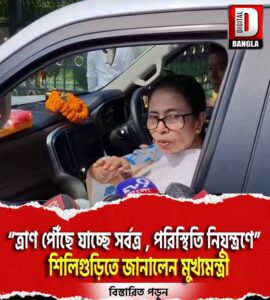 শিলিগুড়িতে মুখ্যমন্ত্রী সাংবাদিকদের মুখোমুখি: “ত্রাণ পৌঁছে যাচ্ছে সর্বত্র, পরিস্থিতি নিয়ন্ত্রণে”উত্তরবঙ্গের বন্যা পরিস্থিতি তদারকির জন্য শিলিগুড়িতে গত সোমবার পৌঁছেছিলেন মুখ্যমন্ত্রী মমতা বন্দ্যোপাধ্যায়। আজ কলকাতা ফেরার আগে তিনি সাংবাদিকদের মুখোমুখি হয়ে জানান, “উত্তরবঙ্গের সব বিধ্বস্ত এলাকায় ত্রাণ পৌঁছে দেওয়া হচ্ছে। গতকাল রাত থেকে প্রায় ৪০০টি ত্রাণ ব্যাগ তৈরি করা হয়েছে। এই ব্যাগে রয়েছে লঙ্কা, হলুদ, সহ প্রয়োজনীয় সামগ্রী ও মহিলাদের শাড়ি থেকে শুরু করে প্রয়োজনীয় জিনিসপত্র।