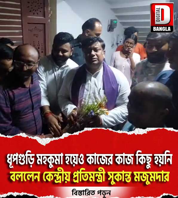 কিন্ত মহকুমা হয়ে কাজের কাজ কিছু হয়নি।লোকসভা ভোটে সব পাল্টে গিয়েছে।মানুষ আর ভুল করবে না।ললিপপকে ছুড়ে ফেলে দিয়ে নরেন্দ্র মোদীর পক্ষে থাকবে।পাশাপাশি রাজ্য সরকার পুর ভোট করাতে ভয় পাচ্ছে হেরে যাওয়ার ভয়ে,সেই কারণে ভোট হচ্ছে না।আগামী বিধানসভা নির্বাচনে ধূপগুড়িতে বিজেপি জিতবে।বৃহস্পতিবার কোচবিহার থেকে শিলিগুড়ি ফেরার পথে ধূপগুড়িতে সাংবাদিকদের মুখোমুখি হয়ে এমনই মন্তব্য করলেন কেন্দ্রীয় মন্ত্রী সুকান্ত মজুমদার।