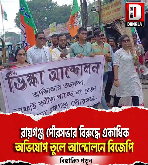 রায়গঞ্জ শহরে পৌর পরিষেবা সহ পৌরসভার বিরুদ্ধে একাধিক অভিযোগ তুলে বিক্ষোভ সামিল হল বিজেপি। শনিবার দুপুরে রায়গঞ্জ শহরে প্রতীকী ভিক্ষা করে মিছিল করে বিজেপির কর্মী সমর্থকরা। এদিন দুপুরে বিজেপি নেতা অভিযোগ করেন রায়গঞ্জ পৌরসভা নাগরিক পরিষেবা দিতে ব্যর্থ,শহরের রাস্তাগুলো জঞ্জালে ভরে উঠেছে ,সাফাই কর্মীদের বেতন বোনাস কিছুই দেওয়া হয়নি,এদিন থালা বাটি হাতে নিয়ে রাস্তায় ভিক্ষে চেয়ে প্রতিবাদ করেন তারা।