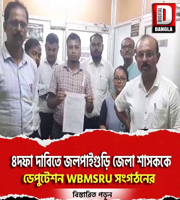 বিভিন্ন দাবিতে মঙ্গলবার জলপাইগুড়ি জেলাশাসক দপ্তরে দ্বারস্থ হল ওয়েস্ট বেঙ্গল মেডিক্যাল এন্ড সেলস রিপ্রেজেন্টেটিভ ইউনিয়ন জলপাইগুড়ি জেলা কমিটি। এদিন ইউনিয়নের সদস্যরা নিজেদের দাবিদাওয়া সম্মিলিত ডেপুটেশন তুলে দিতে উপস্থিত হলেন জেলা শাসকদপ্তরে। মূলত ৪ দফার দাবিতেই তাদের এই ডেপুটেশন কর্মসূচী বলে জানা গিয়েছে। ডেপুটেশনে দাবী করা হয় সেলস প্রোমোশন এমপ্লয়িজ অ্যাক্ট, ১৯৭৬ কার্যকর করা, নতুন চারটি শ্রম কোড বাতিল করা, সেলস প্রোমোশনকে শিল্প হিসেবে স্বীকৃতি দেওয়া , চিকিৎসা প্রতিনিধিদের হাসপাতাল-প্রতিষ্ঠানে বাধাহীন প্রবেশাধিকার নিশ্চিত করা সহ অন্যান্য দাবিতে এদিনের কর্মসূচী বলে জানান সংগঠনের জেলা সম্পাদক অভিজিৎ গাঙ্গুলি। তিনি আরও বলেন “চিকিৎসা প্রতিনিধি কর্মীদের ন্যায্য দাবি রক্ষায় সরকারের অবিলম্বে কার্যকর ব্যবস্থা প্রয়োজন।”
