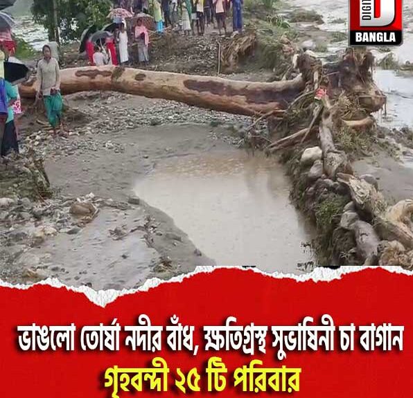 ভাঙলো তোর্ষা নদীর বাঁধ, ক্ষতিগ্রস্থ সুভাষিনী চা বাগান,গৃহবন্দী ২৫ টি পরিবার